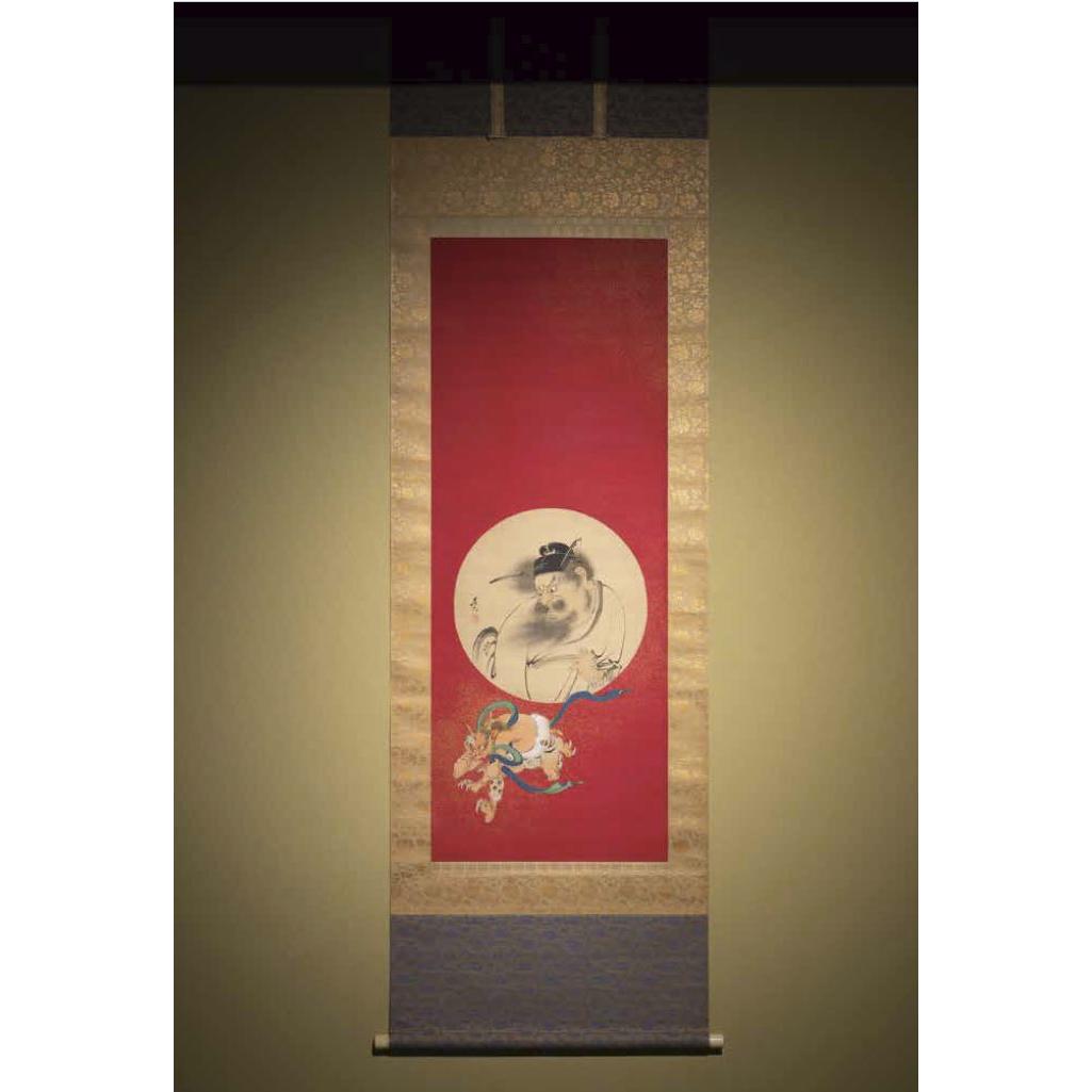 改めて作品を見てみると、まず目にとまるのは背景の朱色である。この鮮やかな朱色背景によって非常にモダンな印象を与える作品となっているが、この「朱色」は江戸時代頃から鍾馗の図と同様に魔除けや厄除けの力があると信じられており、古くから宮殿や神社仏閣などにもよく使われていた色であり、祝い膳などにも朱色の漆塗りの器が使われることも多い。