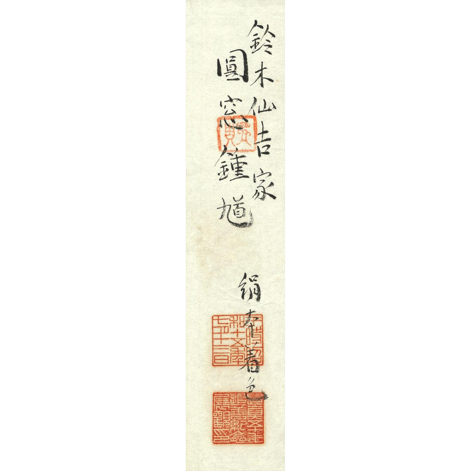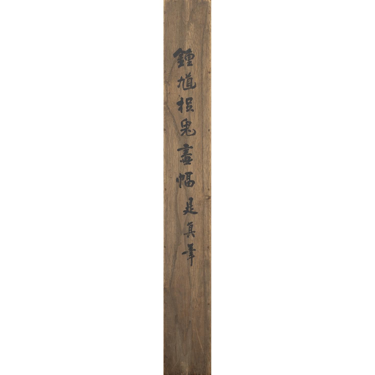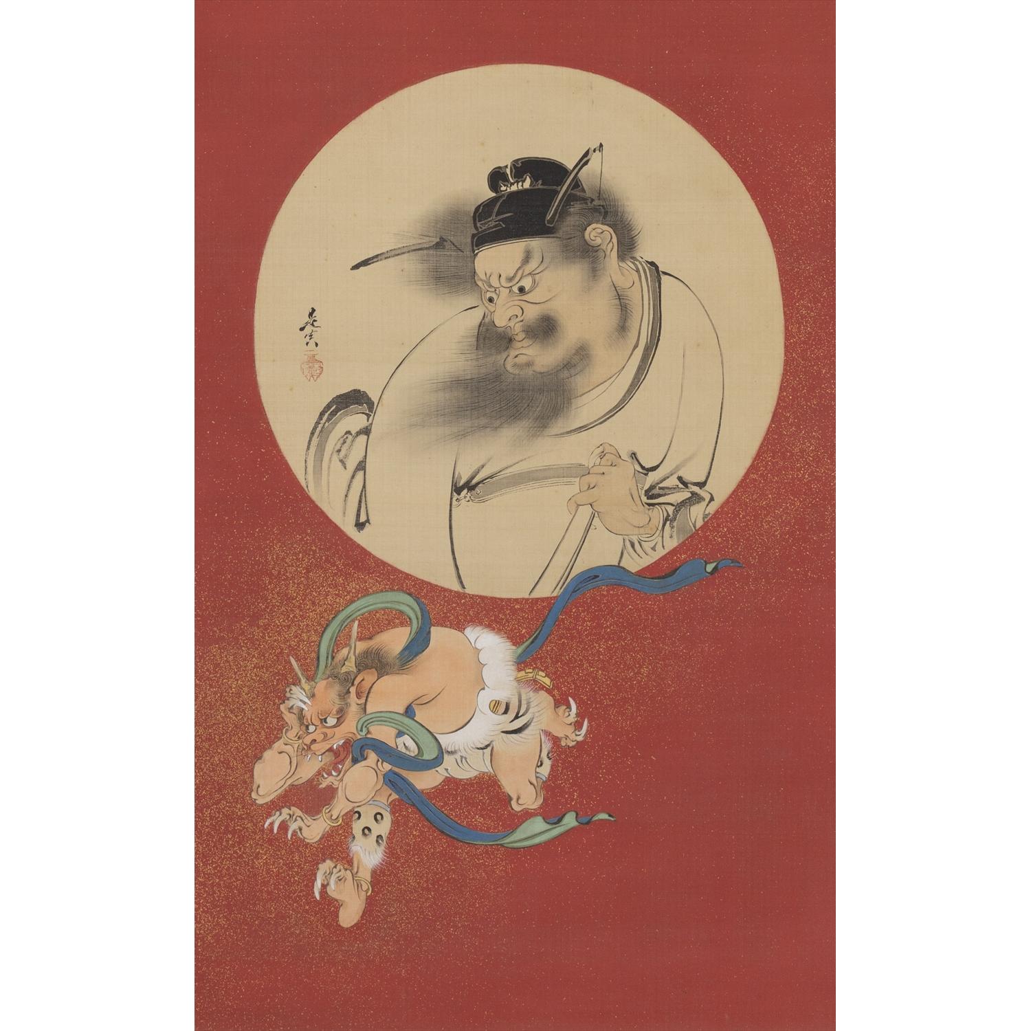 本作品は昭和15年 (1940年)、柴田是真の三男である梅澤隆眞氏の主催で築地・八百善にて開催された『柴田是真五十年記念追善會展』に出品された作品となっている。会場となった八百善は宝暦年間に創業し江戸一の料理屋とされ、酒井抱一との関りもあり、八百善の紹介された冊子「江戸流行料理通」の表紙には酒井抱一の絵が掲載されているなど伝統的で美術への造詣も深い場所であるが、震災や戦災により現在は鎌倉に場所を移されている。また、展覧会の協賛としては、幼少期から是真の絵画への親しみがあった日本画家の鏑木清方や美術評論家の外狩素心庵が名を連ね、展覧会への作品出品者として山種美術館の設立者であり山崎種二や多くの実業家、政治家の名前がその目録に残されている。本作品は「繪畫 圓窓鍾馗 絹本着色」として記録され、その所有者は鈴木仙吉家となっている。作品に付属する展覧会出品札にも同様の文言が記されており、この『柴田是真五十年記念追善會展』へ出品されたという来歴は、本作品の価値を押し上げるのに一役買っているといえるであろう。