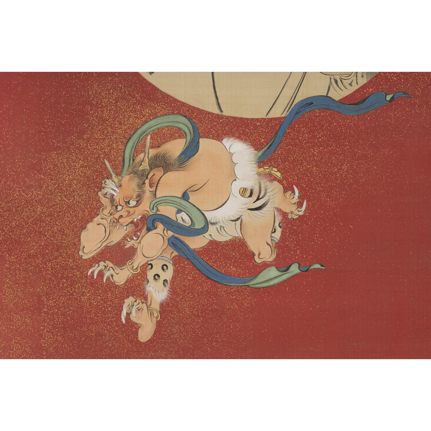 鍾馗の顔はいかめしく、長く伸びた爪のある左手で宝剣を握る。円窓の中から外へと飛び出て逃げ惑う小鬼の表情はどこかコミカルな要素をもち、俵屋宗達の「風神雷神図屏風」(図4参照)を想起させる。小鬼の肩巾(ひれ)にも鮮やかな色彩が使用されており目を引くが、細部をよく見ると鍾馗の髭や小鬼の毛先の描写などは非常に細かく、蒔絵師としての是真の技術力の高さも再確認させられる。また、円窓から出て来た小鬼の背景に金砂子を施すことによって、遠近感が付与され円窓の内と外がはっきりと区別されている点も注目に値するであろう。