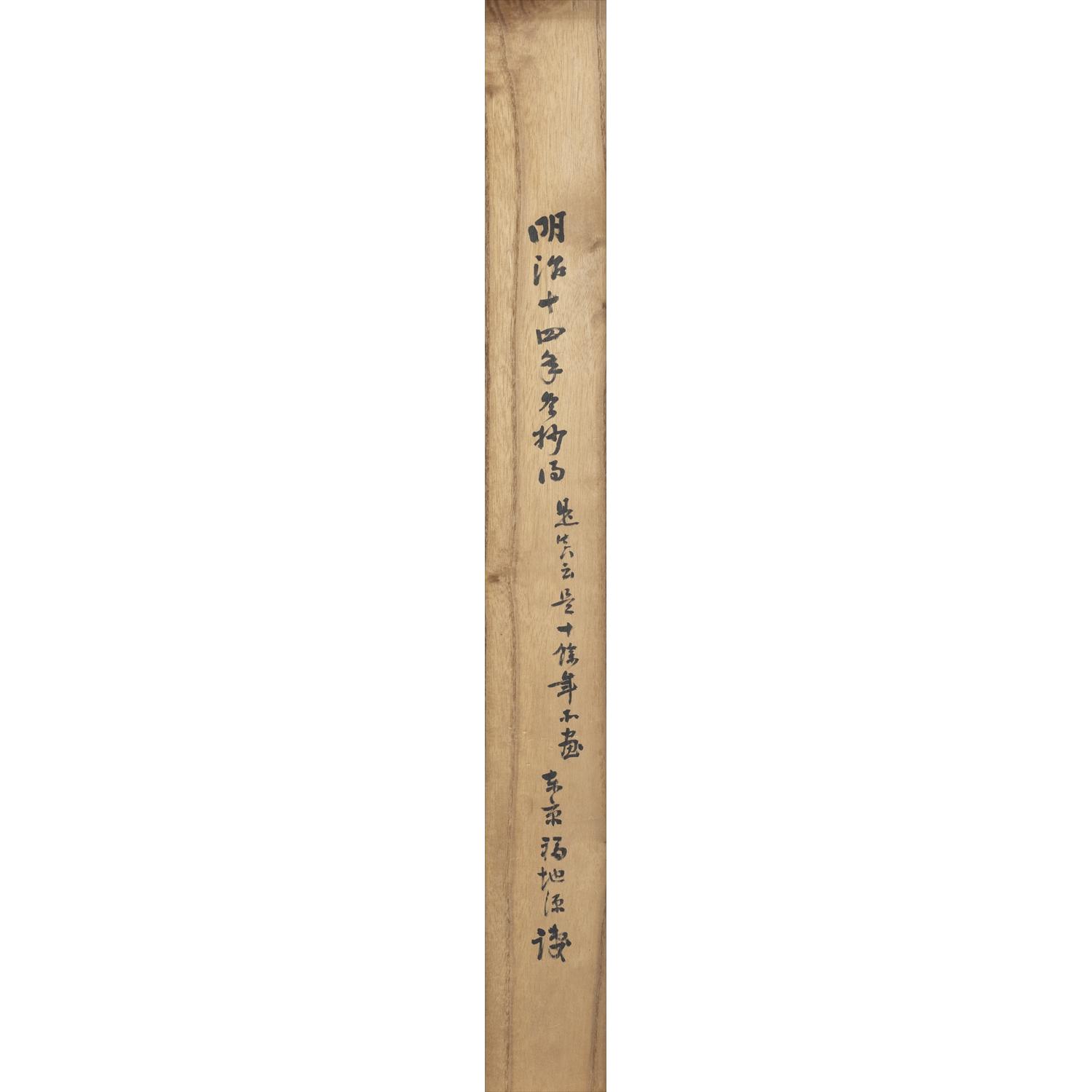 作品の左には「是真」の墨書き落款に「是真」の白文壺型朱印。作品の箱には明治時代の政論家・劇作家・小説家であった福地源一郎氏による箱書がなされている。