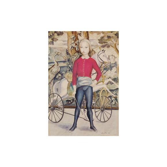 少年の右手には騎士らしく馬鞭があり、一方で背後には白馬の三輪車が置かれており、真剣な少年の面差しと玩具の取り合わせはちぐはぐでありつつユーモラスで、画家の遊び心がうかがえる。実はこの三輪車は実在し、19世紀フランス第二帝政の皇帝ナポレオン3 世が息子のためにフランスを代表するメゾン・Hermès(エルメス)に注文した品で、現在もエルメスの3代目エミールの蒐集品を飾る書斎で大切に保管されている。藤田は1951年に、フォーブール・サン=トノレ24番地のエルメスのショーウィンドウに飾られていたこの玩具をスケッチし、油彩画や版画作品でも表したので、とても気に入ったモチーフであったと偲ばれる。