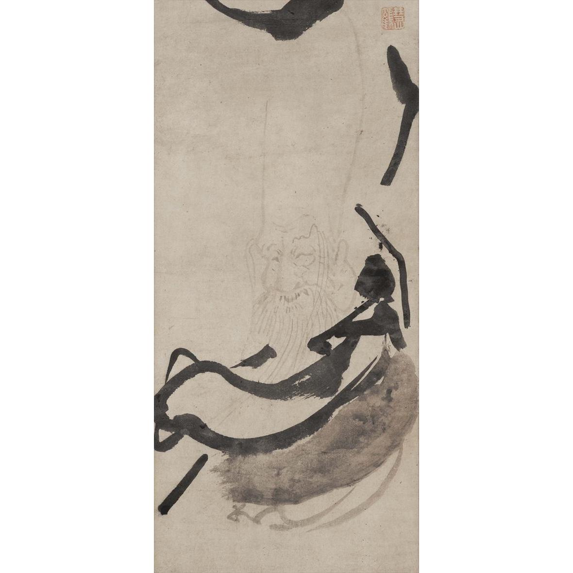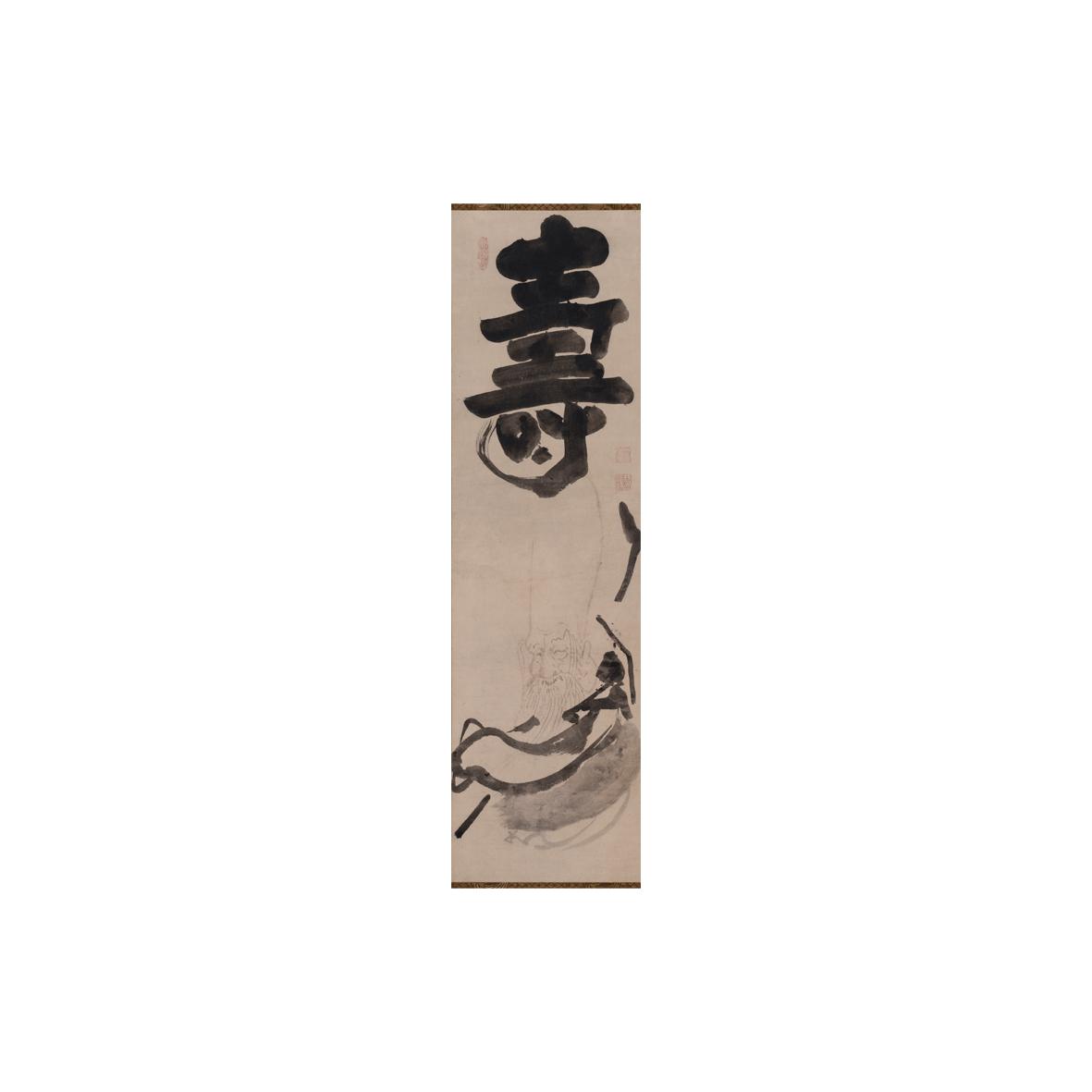 画面の上半分を大胆に支配するのは、漆黒の墨で揮毫された「寿」の一字。この一字を白隠は単なる記号としてではなく、一つの仏や神のごとき確かな存在感を持って描き出す。古来、この「寿」という文字は「ことぶき」の他、「いのちながし」とも読み、文字通り「命が長いこと」、すなわち永遠に続く生命の輝きを象徴する。白隠が揮う筆跡では「寿」の文字そのものが「命の力」を体現し、不動のエネルギーを湛える。この墨の気迫は、一目見た瞬間に鑑賞者の心を捉える力を持っているが、この厳格とも言える濃墨の「寿」の直下に目を転じれば、そこには白隠芸術の真骨頂である、観る者を和ませるユーモアと慈悲の世界が広がっている。画面中央から下部にかけて描かれているのは寿老人である。寿老人は、中国の道教に由来する神であり、南極老人星の化身とされ、人々の寿命を司るその姿は、通常、長い頭部と長い白髭、そして手には人々の寿命を記した巻物を結わえ付けた杖を持つ姿で表され、七福神の一柱としても広く親しまれてきたモチーフである。本作品では長い杖を肩口に携えて袈裟を着た様子が描かれており、最下部に見えるのは足であろうか。特に目を引くのは、薄墨で描かれ、誇張された「頭の長さ」である。白隠はこの寿老人の特異な造形を、文字通り「寿(いのちながし)」という概念の視覚的な比喩として描きだす。高く長く伸びた頭部は、ただ単に知識や知恵が詰まっていることを示すだけでなく、途切れることなく続いていく「長い命」そのものを象徴し、上部に掲げられた「寿」の文字が持つ「いのちながし」という意味を、白隠はその下に描いた寿老人の長い頭部という極めて具体的かつユーモラスな形によって、重ねて強調している。作品上部の力強い濃墨と下部の軽やかな薄墨。この極端なコントラストは、この世の真理、すなわち仏教哲学における存在(有)と非存在(空)が表裏一体であることも示唆するものであろう。