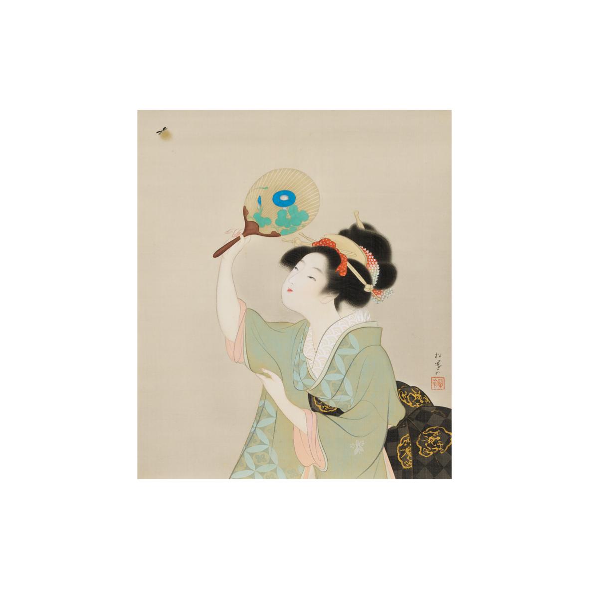 上村松園が終生描き続けたのは、単なる美しい女性の姿ではない。それは、日本人が古来より大切にしてきた、季節の移ろいを感じ取る繊細な感性であり、日常の中に美を見出す精神の貴さであった。この「螢かりの図」には、松園が愛した古典の世界と、彼女自身が戦い抜いた画道への情熱が静かに同居している。螢の光を追うその一瞬に、永遠の美を封じ込めた本作は、まさに蒐集家にとって、次代へと語り継ぐべき作品のひとつであると言っても過言ではないであろう。