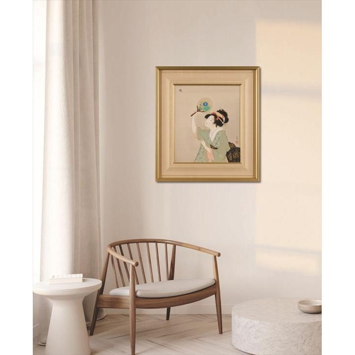 女性が手にする団扇に目を向ければ、そこには鮮やかなブルーの朝顔が描かれている。朝顔の花言葉は「明日もさわやかに」「固い絆」といった前向きな意味を持つ一方で、その短命な開花から「はかない恋」を暗示することもある。螢の淡い光と、団扇に描かれた朝顔の対比は、夏の夜の短さと、その一瞬に賭ける美意識を重層的に表現し、団扇越しに透ける背景の余白は、単なる空白ではなく、湿り気を帯びた日本の夏の夜気を体現しており、観る者を作品の世界観へと深く誘う。