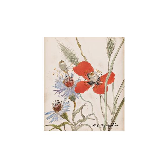 フジタが描き出した花の作品では、そのモチーフとして薔薇やチューリップなどが多く使用されているように思われる。しかし、本作品ではそれまでに殆ど描かれることのなかった芥子と矢車菊が描かれており、且つ、そのそれぞれがフランスの国花に該当するという事実だけでも、そこに偶然とはいえない画家の意志があったことは明らかであろう。その点においても、本作品は単なる静物画という範疇を超え、一人の芸術家が最も困難な時代に抱いた「愛国心」と「芸術的野心」が、ミニアチュールという至高の形式によって結実した稀有な一作であるといえ、これほどまでにパーソナルで、完成度の高いフジタの小品に出会える機会は、そう多くないはずである。