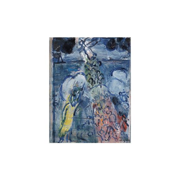 マルク・シャガールの芸術において、インスピレーションの源のひとつとなったのがユダヤの思想である。敬虔なユダヤ教の家庭に生まれ育ち、「幼い頃から、私は聖書の虜になってきた。私はつねに、聖書が古今を通じて詩想の最大の源泉であると思われてきた」と語った画家にとって、ユダヤの歴史はアイデンティティとして根付き、ユダヤの文化から生まれた神秘と恩寵のモチーフで画面を彩った。 今回出品作《La traversée de la mer rouge(開かれた紅海)》は、ユダヤ教の聖典である旧約聖書の一節、預言者モーセがユダヤ人を率いてエジプトから脱出する「出エジプト記」の一場面を描く。 古代エジプトにて、虐げられていたユダヤ人を救う使命を神から受けたモーセは、民族を連れて約束の地(「乳と蜜の流れる地」と言われる現在のパレスチナ周辺)へと向かう。それを知ったエジプトの王は軍隊を差し向け、ユダヤ人たちを紅海に追い詰めると、モーセは神の力で海を割って乾いた海底を民に渡らせ、その後を追ってきたエジプト軍を海に沈めた。 ユダヤ教以外でもよく知られるこのエピソードを描いた本作では、画面左下に光を放つモーセが立ち、その背後に海を渡る人々の姿が表される。そして彼らの頭上には白い天使が浮かび、聖書には記述のない天使の登場は、神の御業と民の守護を象徴するだろう。 本作を制作した翌年、シャガールは旧約聖書の版画集『聖書』を出版しており、そのなかで本作と同じ主題が本作とほぼ同じ構図で描かれている。 この版画集は、1930年に美術商ヴォラールの依頼ではじめられたもので、シャガールも聖書の舞台となるパレスチナやエジプトを訪ねて取材するなど並々ならぬ熱意をもったが、ヴォラールの急死や第二次大戦のために中断を余儀なくされた。そして戦後、出版者テリアードの協力によって発表すると、以降聖書はシャガールが終生追求する最も重要なテーマとなった。 またフランス・ポンピドゥーセンターには本作と同主題・同構図、さらには同年制作の縦2メートル横1.4メートル超の大作が所蔵されており、この奇跡の場面が画家の心に深く刻まれたイメージであったことが偲ばれる。そこには、民を救うのみならず、ユダヤ教の重要な戒律である「十戒」を神より授かったモーセへの敬意や、もしくは画家自身のユダヤ名Moishe(モイシェ)の由来となった偉人への親近感もあったのかもしれない。 本作は、モノクロ版画の『聖書』にはない色彩画家シャガールの本領と、ポンピドゥーセンターの大画面では表しきれないインスピレーションの勢いを見ることができ、小品ながらも画家が夢想するスペクタクルな物語を味わうことができる1作である。
